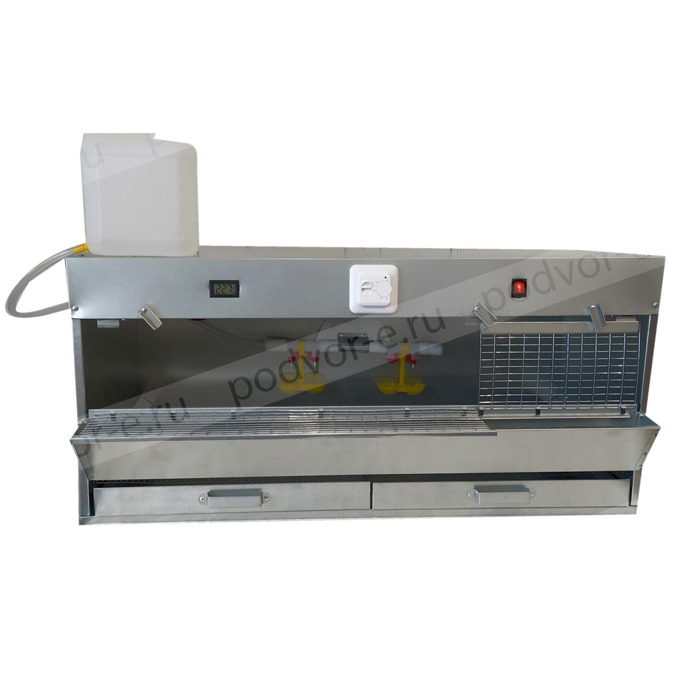 В комплект металлического брудера на 180 цыплят входят: брудер с блоком обогрева на 2 лампы, поилка на 4 ниппеля с емкостью для воды 5 л, бункерная кормушка, поддоны для сбора помета высотой 3 см.