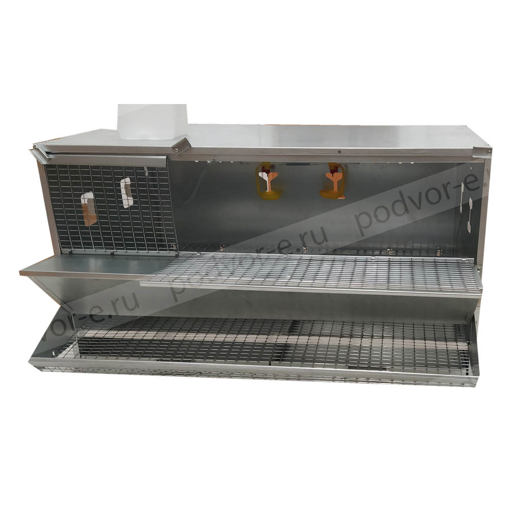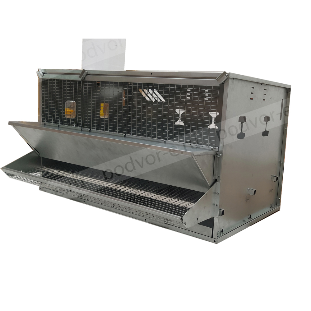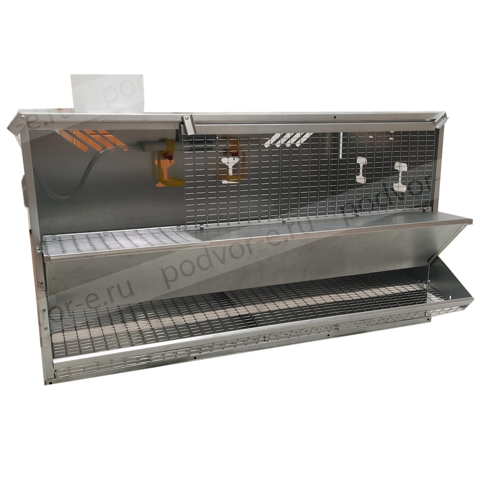 В комплект клетки для кур несушек на 27 голов Вятка с крышкой на кормушке входят: на каждом ярусе бункерная кормушка с крышкой, яйцесборник с высокими бортами, система ниппельного поения, выдвигающийся поддон для мусора и помета, колеса на нижнем ярусе для легкого передвижения клеточной батареи.