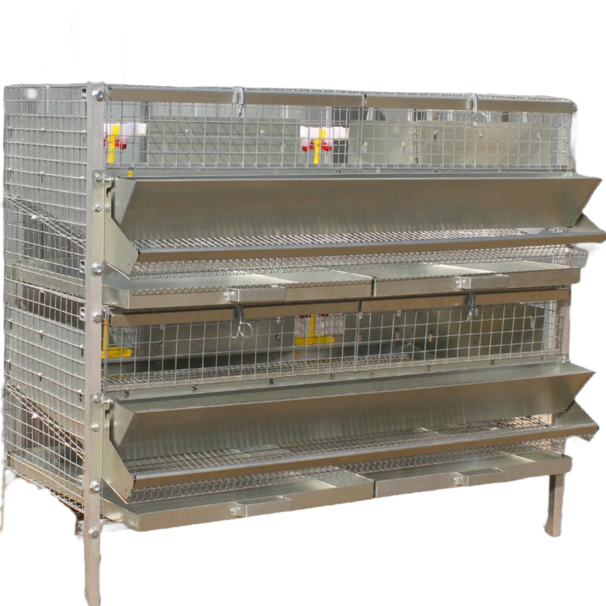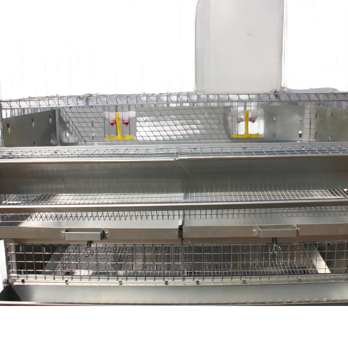 В комплект каждого яруса каркасной клетки Пижанка входят: навесная металлическая кормушка, яйцесборник с высокими бортами, ниппельные поилки, выдвигающиеся поддоны для мусора и помета. Так же в комплекте идет шланги, тройники и бак для воды.