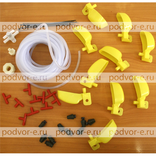 1.Чашечная поилка для кур, перепелов большая - 10 шт. 2.Винтовое крепление для поилок на стеку - 10 шт. 3.Шланг для подключения 10 мм - 10 м. 4.Врезка в бак 1/2 - 1 шт. 5.Штуцер 1/2-10 мм - 1 шт. 6.Кран 10-10 мм - 1 шт. 7.Стяжки для фиксации шланга - 10 шт.