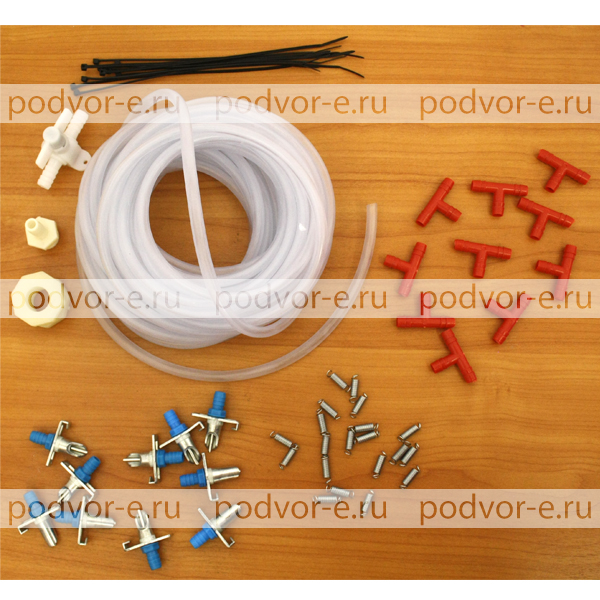 1.Ниппельная поилка для кроликов - 10 шт. 2.Пружины для фиксации поилок к сетке - 20 шт. 3.Тройник пластиковый для разводки шланга 10 мм - 10 шт. 4.Шланг для подключения 10 мм - 10 м. 5.Врезка в бак 1/2 - 1 шт. 6.Штуцер 1/2-10 мм - 1 шт. 7.Кран 10-10 мм - 1 шт. 8.Стяжки для фиксации шланга - 10 шт.