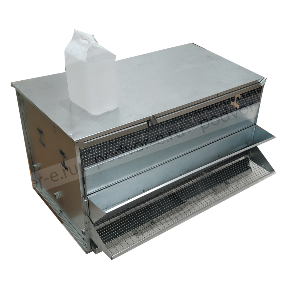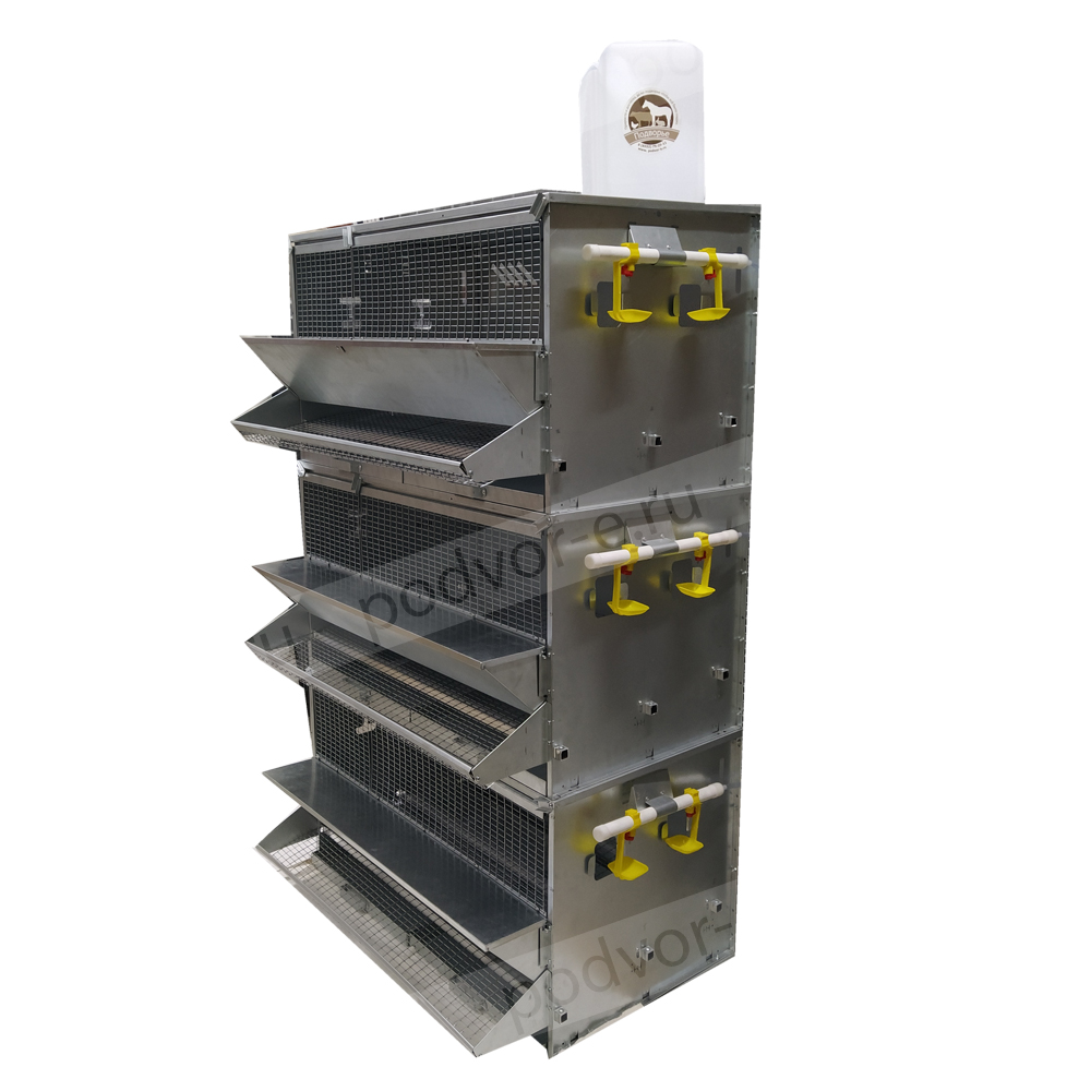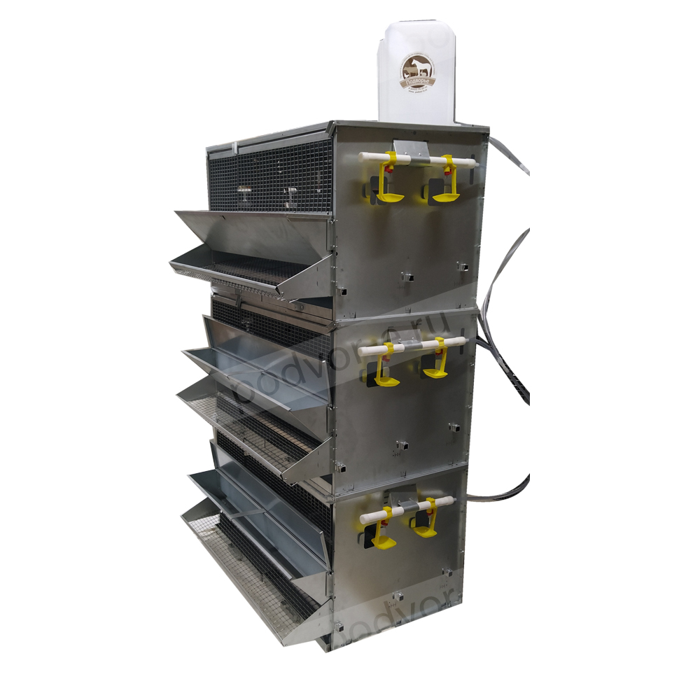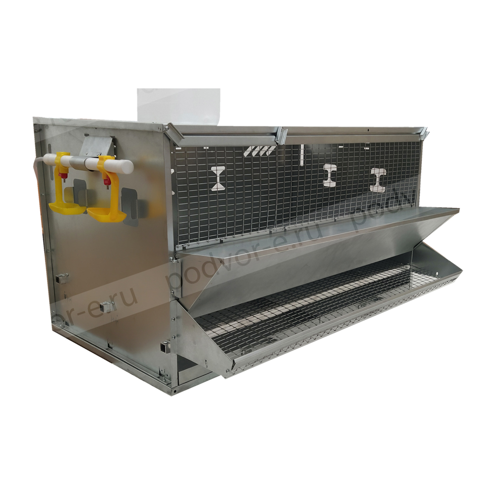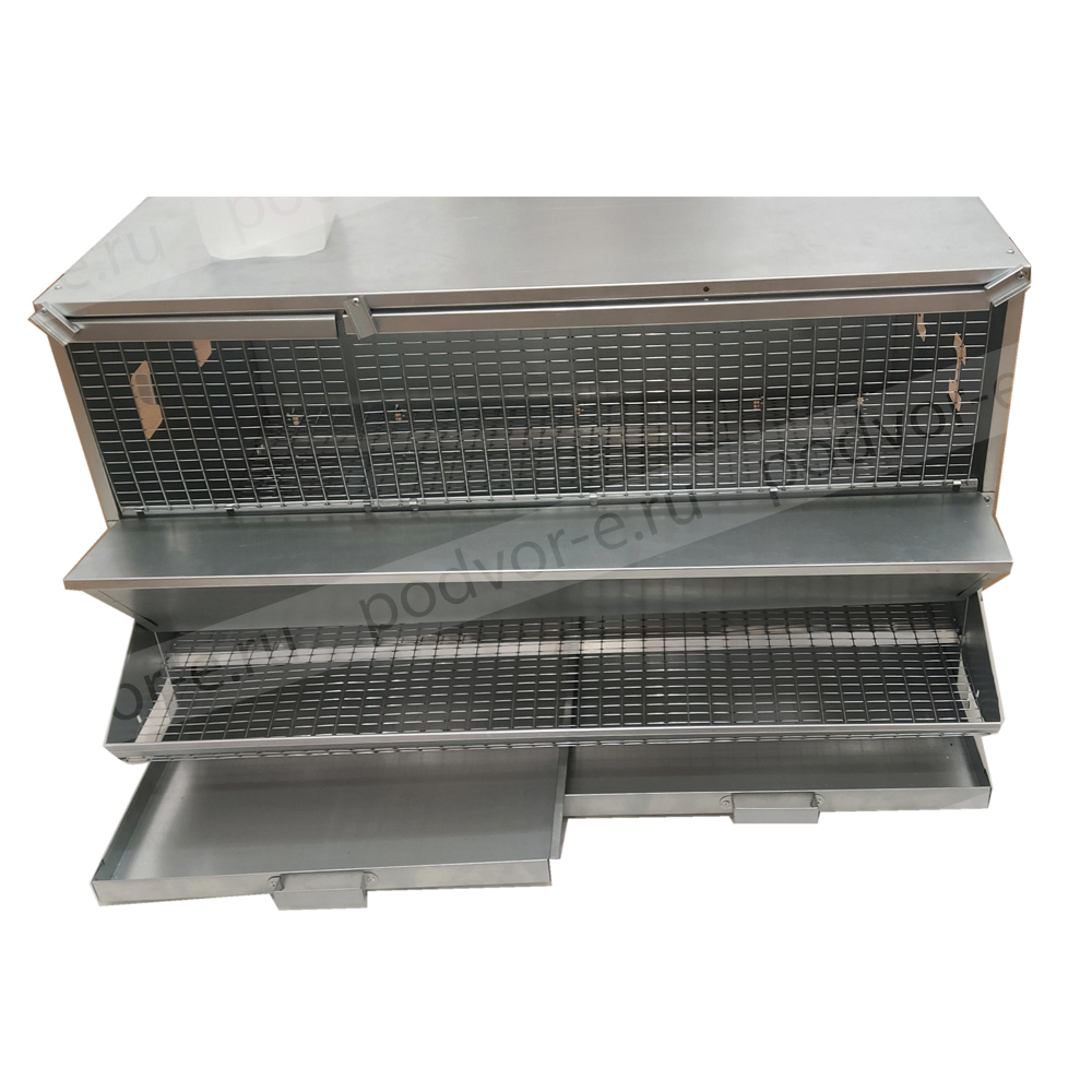 В комплект клетки для кур несушек на 27 голов Вятка с крышкой на кормушке входят: на каждом ярусе бункерная кормушка с крышкой, яйцесборник с высокими бортами, система ниппельного поения, выдвигающийся поддон для мусора и помета, колеса на нижнем ярусе для легкого передвижения клеточной батареи.